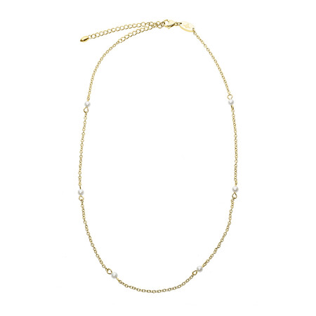 De vita, skimrande konstgjorda pärlorna är integrerade i det fina halsbandet. Halsbandet kan bäras individuellt och fungerar även tillsammans med andra halsband i den aktuella layering-looken, där flera halsband av olika längd bärs tillsammans.